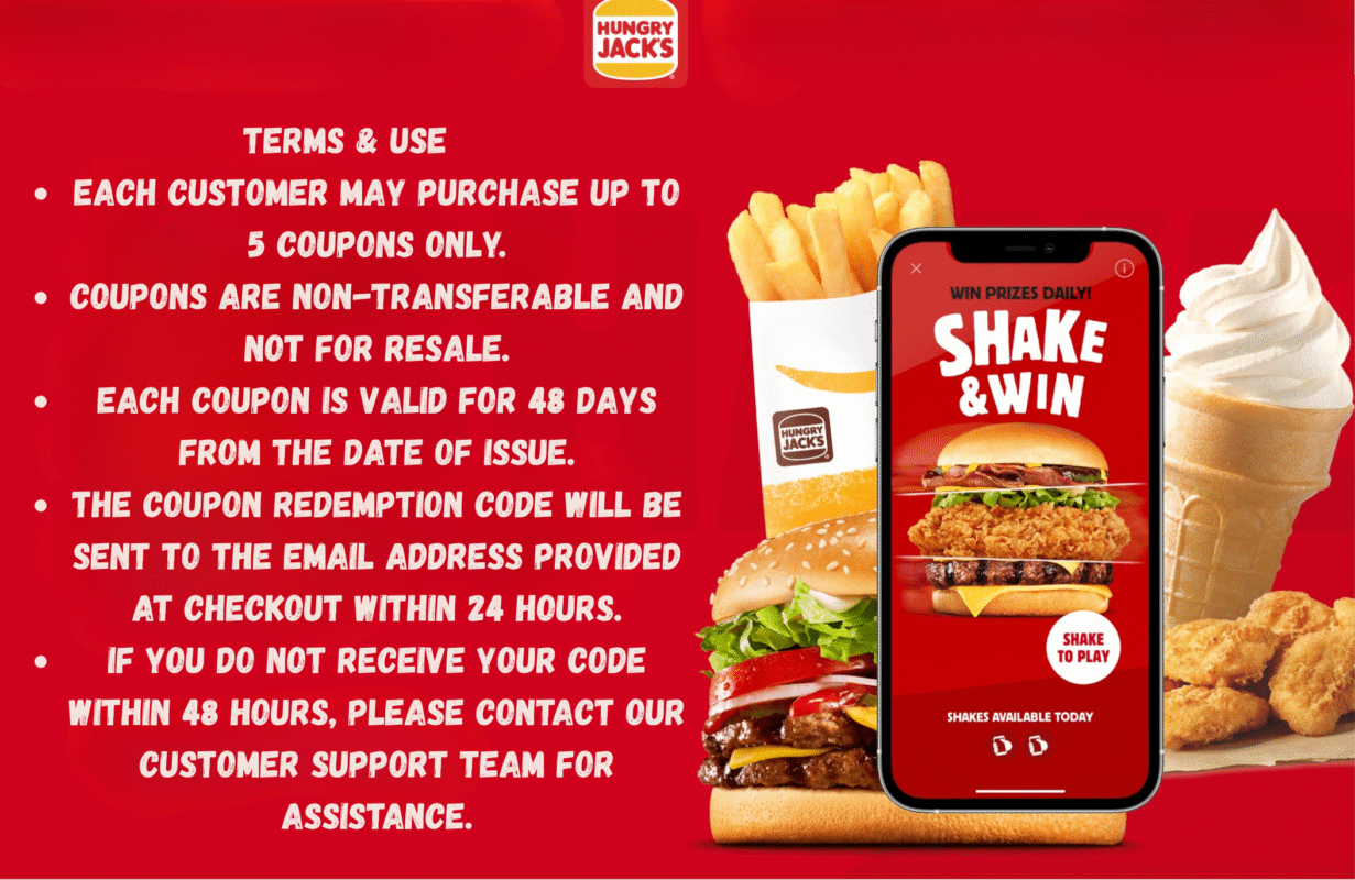 Get a $45 Hungry Jack’s coupon for just $1.85 and enjoy huge savings on your favourite meals. This coupon is valid across all stores and platforms and can be redeemed easily online. Your redemption code will be sent to your email, along with full instructions on how to use it. Perfect for pickup or delivery orders!